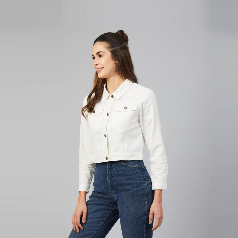 White solid jacket, has a spread collar, 2 pockets, button closure, long sleeves, straight hem, and cotton